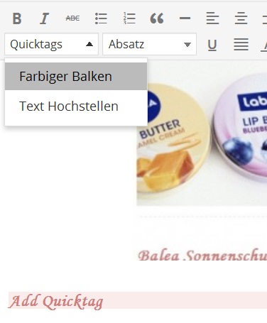 Quicktag sind gut um beim Schreiben bestimmte Sachen die man immer wieder verwendet einfügen zu können, z.B. die verschnörkelte Schrift mit dem rosafarbenem Hintergrund habe ich als solches eingerichtet, da ich das oft für Zwischenüberschriften verwende. Das Plugin hierfür nennt sich Add Quicktag und man kann da so viele Shortcodes für den Editor erstellen wie gewünscht.