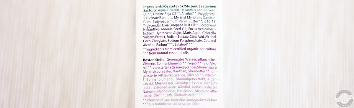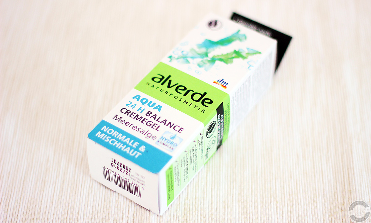 Wie die anderen Cremes von alverde kommt auch das 24h Balance Cremegel Meeresalge aus der Aqua Serie in einer weißen Pappverpackung mit blau-grünem Design. Wie gewohnt befinden sich hier sämtliche Angaben zu Produkt und Hersteller darauf.