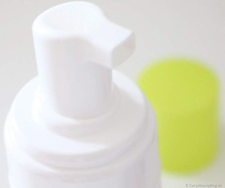 Der Reinigungsschaum kommt in einem hohen Pumpspender mit hellem, giftgrünen Deckel. Das Design ist genauso bunt wie auch schon bei der Pflegecreme – grüner Apfel und Limette und bunte Kreise. Auch dieses Produkt sieht eher aus, als wäre es an Jugendliche ausgerichtet, doch ich lasse mich davon nicht stören ^^ Auf der Rückseite findet man sämtliche Hersteller- und Produktangaben.