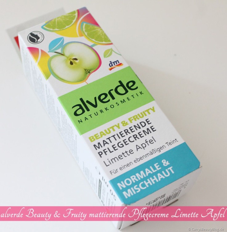 Die mattierende Pflegecreme aus der Beauty & Fruity Reihe kommt wie ziemlich alle alverde Cremes in einer Pappverpackung. Die neue Pflegeserie ist ziemlich bunt gehalten, neben dem grünen Apfel und der Limette findet man noch bunte Kreise die sehr an Tennisbälle erinnern auf der Vorderseite. Insgesamt macht es den Eindruck, als wäre die Serie eher für Jugendliche. Zusätzlich finden sich noch alle nötigen Angaben zu Produkt, Hersteller, Versprechen, Anwendung sowie Inhaltsstoffe rund um den Karton.