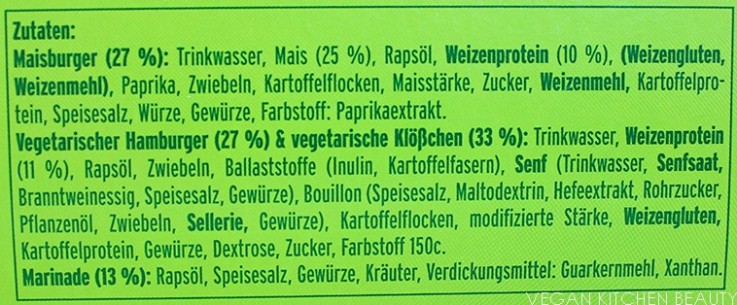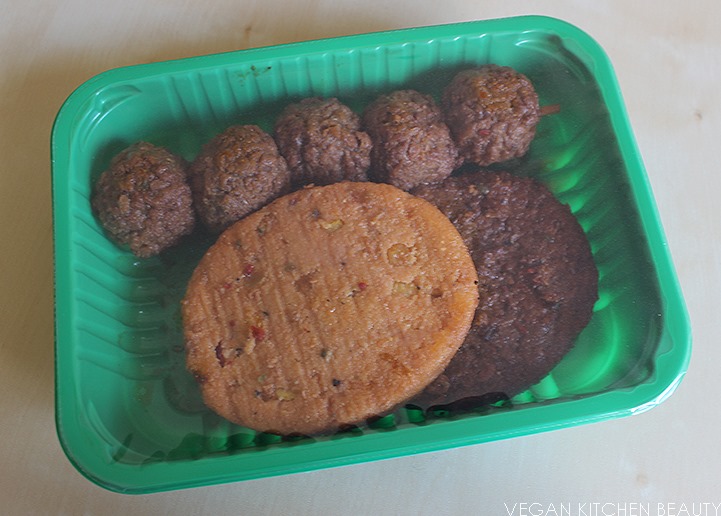 Der Grillmix enthält insgesamt 3 Produkte – ein Klößchenspieß, einen Hamburger und einen Maisburger, allesamt auf Basis von Weizenprotein. Schon in der Verpackung sehen sie allesamt sehr lecker aus, bei pflanzlichen Alternativen zu Fleisch sieht man ja sonst immer wieder seltsame und teils zu perfekte Formen.