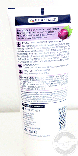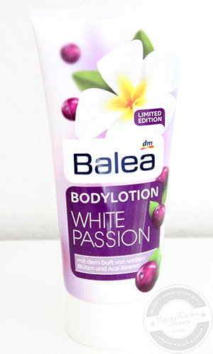 „Lassen Sie sich von der sinnlichen Duftkombination von Früchten und Blüten in eine bezaubernde Fantasiewelt entführen. Die Balea White Passion Bodylotion entführt mit ihrem fruchtig süßen Duft in ein bezauberndes Blütenmeer. Die milde Rezeptur mit pflegenden Inhaltsstoffen schenkt der Haut eine Extraportion Feuchtigkeit und pflegt sie geschmeidig. Die leichte Emulsion lässt sich gut verteilen, zieht schnell ein und sorgt für ein strahlend frisches Aussehen. Tauchen Sie in die zauberhafte Duftwelt von Früchten und Blüten ein!“