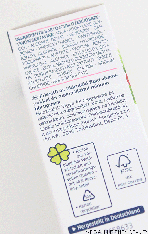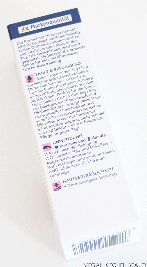 „Feuchtigkeits-Fluid mit Vitamincocktail. + Vitamin E. + Provitamin B5. Die Formel mit Himbeer-Extrakt schenkt der Haut mit ihrem fruchtig-zarten Duft einen vitaminreichen und vitalisierenden Start in den Tag. Die Gesichtshaut wird sanft geschützt. Sie bereitet die optimale Bühne für eine verführerische-frische Ausstrahlung. Balea Frisch in den Tag Fluid – die Haut strahlend schön pflegen. Durch den Vitamin-Cocktail aus Vitamin E und Provitamin B5 pflegt es zuverlässig und schützt vor dem Austrocknen. Perfekt für die junge Haut. Balea Frisch in den Tag Fluid mit belebendem Himbeerduft und Himbeer-Extrakt versorgt deine Haut mit wertvoller Feuchtigkeit und verleiht ihr ein gesundes Aussehen. Die milde Textur mit Panthenol wirkt hautberuhigend, zieht schnell ein und belebt – eine erfrischende Pflege für jeden Tag!“