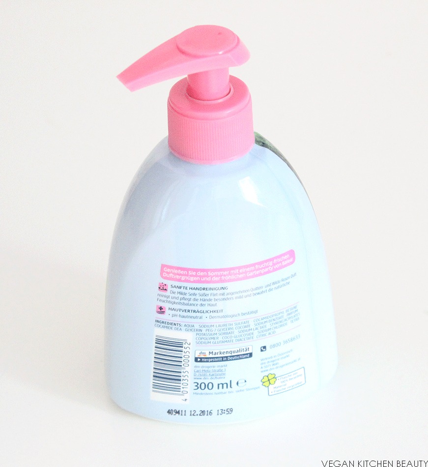 „Die Milde Seife Süßer Flirt mit angenehmen Quitten- und Wilde-Rosen-Duft reinigt und pflegt die Hände besonders mild und bewahrt die natürliche Feuchtigkeitsbalance der Haut“.