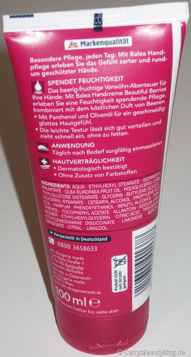 Weiter geht es mit den Reviews zu den ganzen leckeren Neuheiten von Balea ^^ Nach dem neuen Bodycremes folgt nun die Handcreme “Beautiful Berries”. Passend dazu gibt es auch noch eine Bodylotion, diese habe ich allerdings nicht gekauft ;)