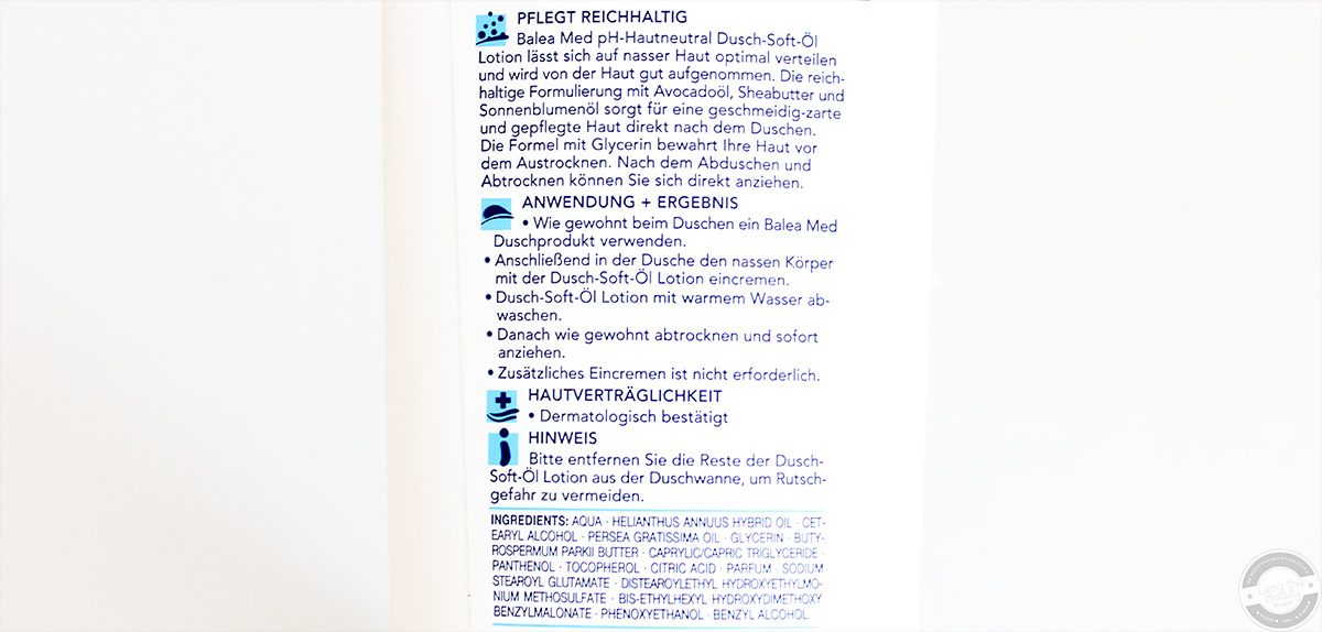 Bei der Anwendung der hautneutralen Dusch-Soft Öl Lotion von Balea Med konnte ich keinen Unterschied zu den anderen In-Dusch Bodylotions feststellen. Es ist zwar etwas dickflüssiger als seine Konkurrenten, lässt sich jedoch genauso einfach und problemlos auf der feuchten Haut verteilen und wieder abspülen.