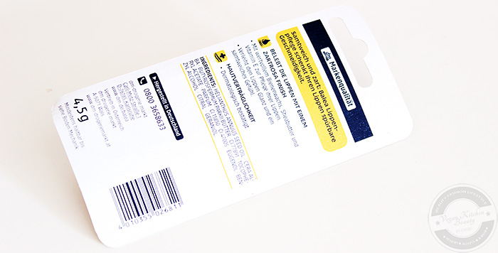 Die Verpackung des Lippenpflegestiftes ist bunt und schrill, womit meiner Meinung nach die (eigentliche) Zielgruppe klar definiert wird. Das Design gefällt mir wirklich gut, da es mal etwas anderes und schriller ist statt immer nur schlicht :) Wie immer befinden sich die meisten Angaben zu Produkt und Hersteller auf der Rückseite. Die Plastikhülse ist in weiß-rotem Swirled-Look gehalten, genau wie auch der eigentliche Pflegestift.