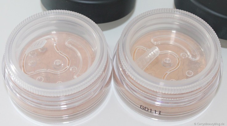 Die beiden Foundations passen von der Farbe her recht gut zu meinem Teint, gemischt ist es dann die ideale Farbe. Übrigens kann man die Öffnung der Tiegelchen wiederverschließen, das ganze Stück kann man am Rad drehen und so die Öffnung verschließen ^^