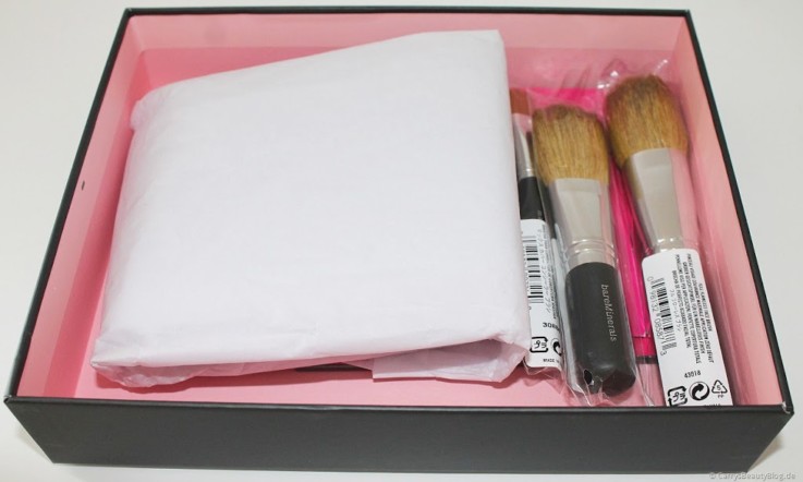 Die Verpackung des Get Started Kits gefällt mir sehr gut. Das Set kommt in einem schwarzen Karton mit ansprechend gestaltetem Umkarton, der die enthaltenen Produkte zeigt und beschreibt. Die Pinsel sind alle in einer Plastikfolie verpackt, die Mineralpuder in Seidenpapier eingeschlagen. Das ganze macht einen echt hochwertigen Eindruck, die Mineralpuder sind alle versiegelt.