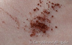 Der Bronzer ist zwar sehr dunkel, lässt sich aber im Gesicht problemlos verblenden und dem Teint anpassen. Der Glitzer den man auf dem Swatch sieht, verliert sich aufgetragen völlig ist und ist dann auch nicht mehr zu sehen.