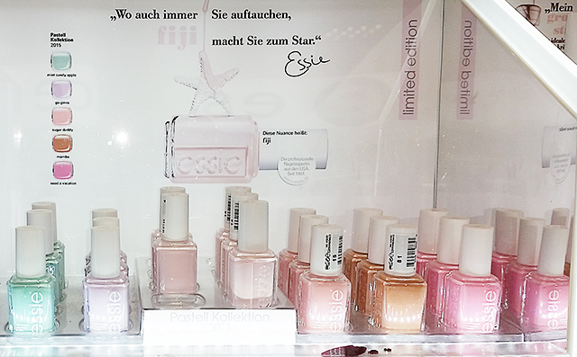 Zuerst kam die Kollektion zu Douglas*, wo ich auch direkt 2 Fijis gekauft habe, kurz darauf war sie auch bei Müller zu finden, wo es wirklich ausreichend Fiji für alle geben sollte. Neben Fiji enthält sie übrigens auch die begehrten Lacke „Need a vacation“ und „Mamba“, wobei ich letzteren alles andere als hübsch finde. Zudem findet man noch „Sugar Daddy“, „Mint Candy Apple“ sowie „Go Ginza“ in der Pastell Love LE von essie.