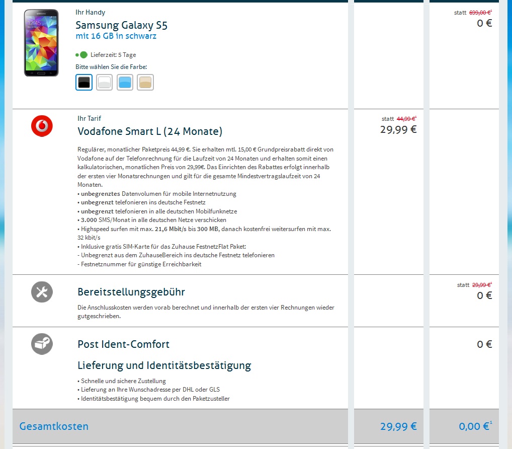 Sobald man sich seinen Wunschvertrag ausgewählt hat, wird man zum Warenkorb weitergeleitet. Dort erhält man noch einmal eine Übersicht, was man nun für das Handy zuzahlen muss, was der Vertrag im Monat kostet und ob eine Bereitstellungsgebühr anfällt. Zudem sieht man dabei auch direkt, wie viel man sich dabei nun einspart.