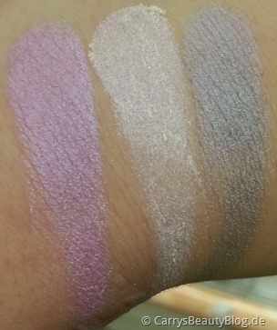 Auch ein paar Swatches habe ich für euch gemacht, nur leider gab es vom Shimmer Powder sowie den Kajalstiften keine Tester. Das Puder sieht aber sehr glitzerig aus und der lila Farbton erweckt den Eindruck, als würde es sich hierbei lediglich um ein Overspray handeln.
