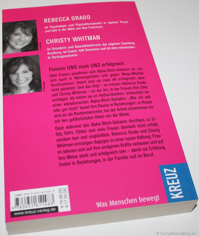 “Viele Frauen gewöhnen sich Alpha-Bitch-Gebaren an, um sich auch in Männergefilden und gegen Mega-Mac*hos durchzusetzen. Damit sind sie zwar oft erfolgreich, aber nicht glücklich. Und das liegt – so meinen Rebecca Grado und Christ*y Whitman – an der Art, in der Frauen ihre Ziele verfolgen. Als lebten sie im Haifischbecken, entwickeln sie einen kämpferischen Alpha-Bitch-Komplex: „Wie ich will oder gar nicht“ lautet ihre Devise in Beziehungen; zu Hause sind sie die Bestimmerinnen; bei der Arbeit schwimmen sie mit den gefährlichsten Haien um die Wette. Doch während das Alpha-Bitch-Gebaren durchaus zu Erfolg führt, fühlen sich viele Frauen dennoch nicht erfüllt, sondern leer und unglücklich. Rebecca Grado und Christ*y Whitman ermutigen dagegen zu einer neuen Haltung: Frauen können sich auf ihre ureigenen Kräfte verlassen und auf ihre Weise stark und erfolgreich sein – damit sie Erfüllung finden in Beziehungen, in der Familie und im Beruf.”