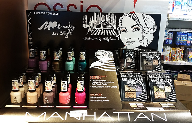 Bei essence und Catrice wurde ich zwar nicht fündig, dafür aber bei Manhattan. Es wartete nämlich die Manhattan ♥ Beauty in Style LE im Regal auf mich, welche eine große Auswahl an Nagellacken sowie vier Lidschattenquattros enthält, deren Verpackungen allesamt von Lily Qian designed wurden.
