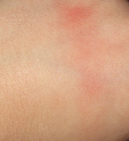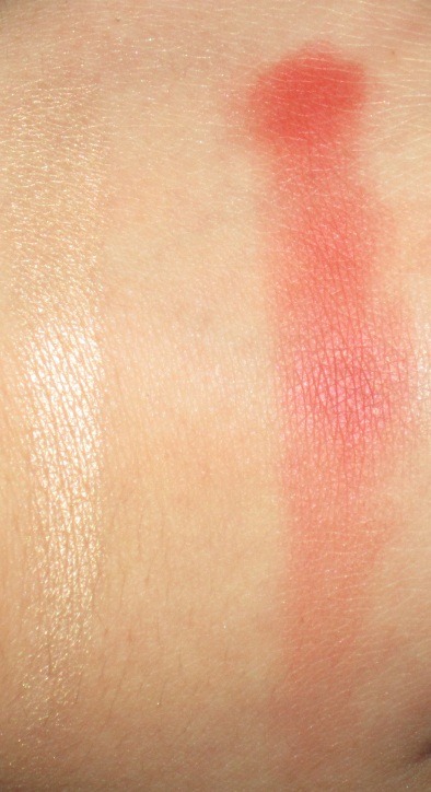 links: Shimmer Powder und Rouge in einem Zug, mitte: beides verwischt,