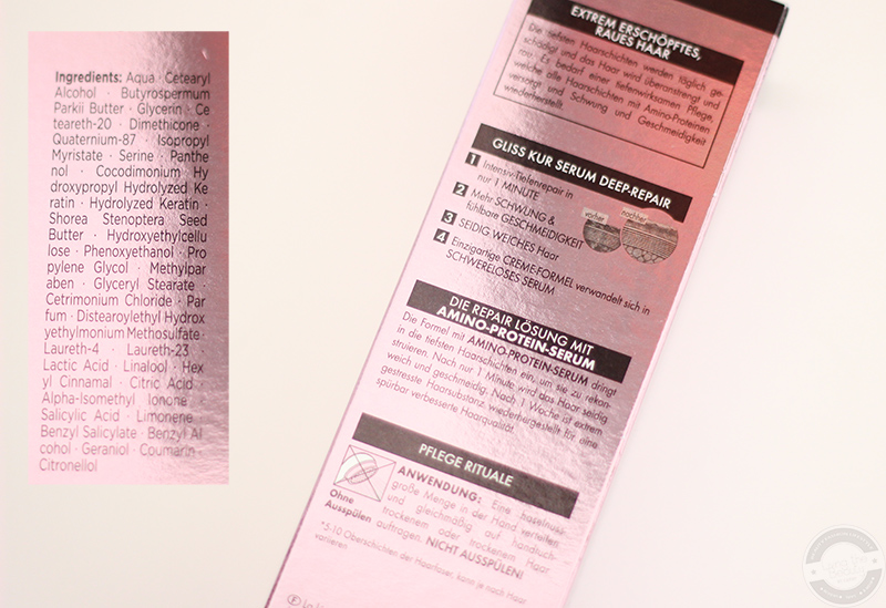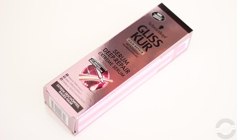Das Hair Repair Serum von Gliss Kur kommt in einer metallisch schimmernden, leicht dunklen roséfarbenen Pappschachtel, auf dem sich sämtliche Informationen und Produktversprechen rund um das Serum und den Hersteller befinden.