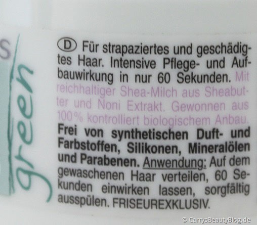Das hier ist meine kleine Wunderkur. Design ist wie das des Shampoos, nur eben in Form eines Tiegels durch den man das Produkt entnimmt. Zwar finde ich Tuben bzw. Flaschen hygienischer, da man das Produkt aber direkt wieder auswäscht, finde ich den Umstand jetzt nicht ganz so tragisch.