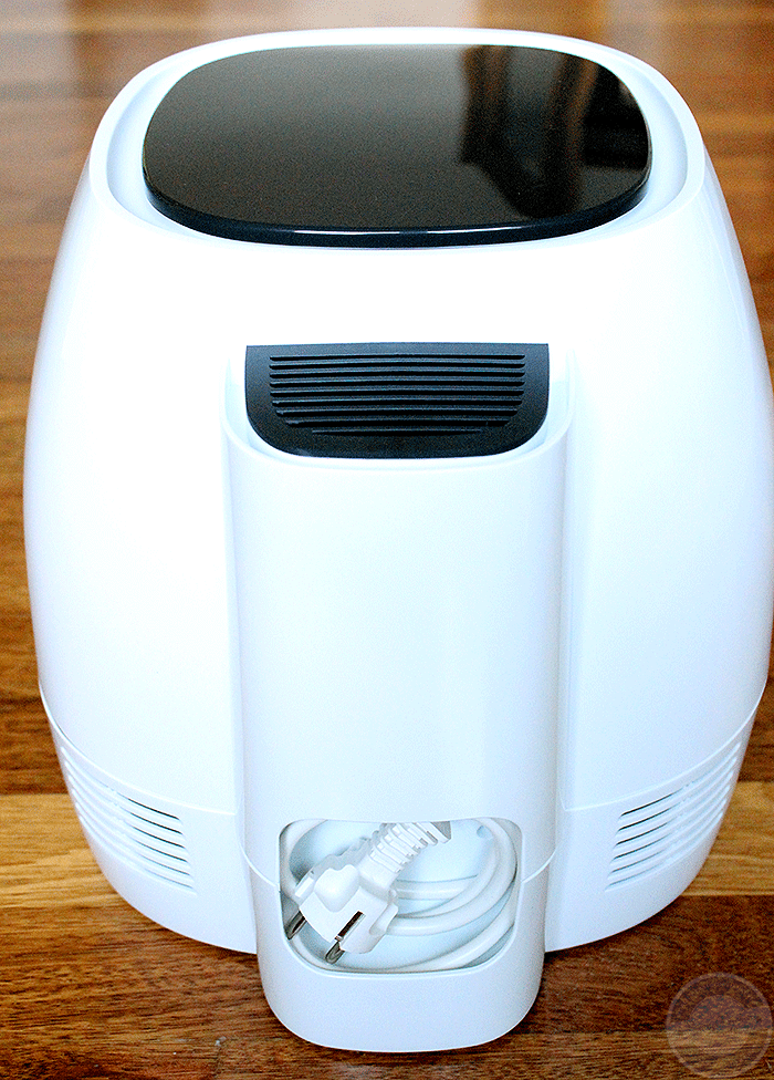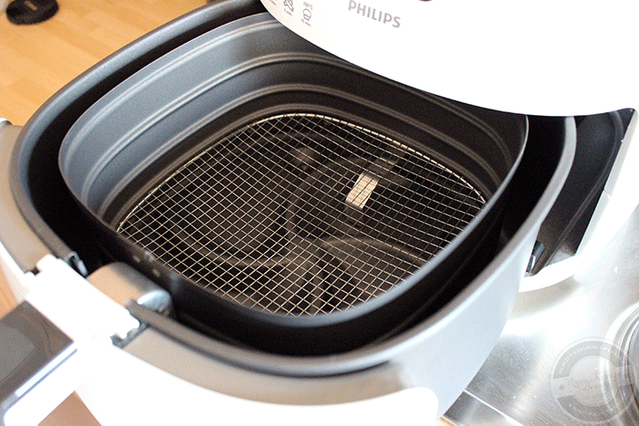Das Fach mit dem Frittierbehälter lässt sich einfach öffnen und wieder schließen – wenn man nicht den selben Fehler begeht wie ich :D Ich habe beim ersten Mal gedankenverloren den Behälter außerhalb gelassen, um die Kartoffeln einfach einfüllen zu können. Danach stand ich dann vor dem Problem, wie ich es nun wieder aufbekomme. Mit einem Handtuch und Griff in die Lücke ging es dann aber.