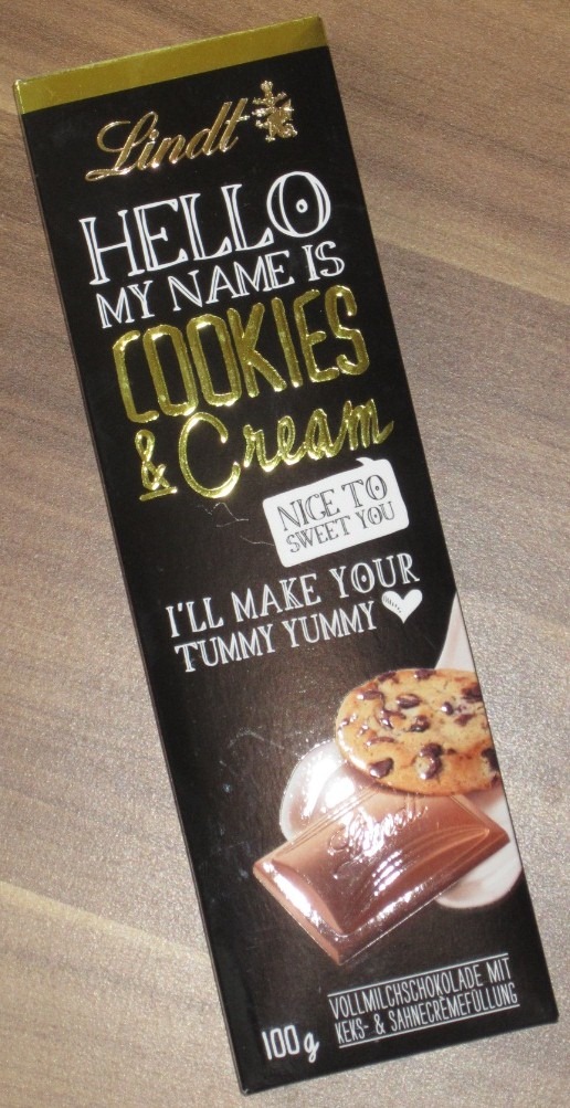 Ich bin so ein Werbungsopfer ^^” Nachdem ich bereits des Öfteren  die Werbung zur neuen Schokoladenreihe von Lindt, “Helly my name is”, im Fernsehen gesehen habe, muss natürlich die Sorte “Cookies & Cream” beim letzten Einkauf mit in die Einkaufstasche wandern. Dadurch, dass die Schokoladentafeln alle nach irgendwelchen Häagen Dazs Eissorten benannt sind hatte ich die Hoffnung, dass die Tafeln ähnlich schmecken.