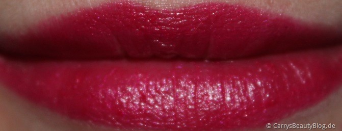Der Geruch des Lippenstifts ist himmlich, er erinnert mich total an den “Mango Peach Salsa” Duft von Yankee Candle, meinem Lieblingsduft <3 Einfach fruchtig-frisch, aber auf keinen Fall aufdringlich sondern im Gegenteil, sehr angenehm! Bei der Farbe handelt es sich um einen leicht himbeerstichigen Rotton, den Perleffekt sieht man deutlich.