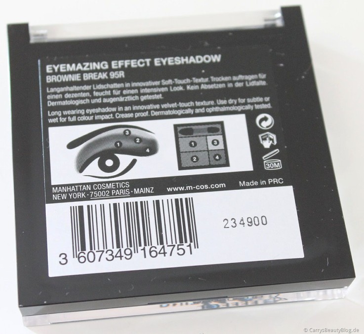 Wie ihr vielleicht mitbekommen habt, war ich vor ein paar Wochen beim Beauty Blogger Café in Berlin, wo unter anderem auch die Kosmetikmarke Manhattan vertreten war. In deren Goodie-Bag waren ein paar nette Kleinigkeiten eingepackt, wozu auch das Lidschattenquad gehört, welches ich euch hier kurz vorstellen möchte. Der genaue Produktname lautet “Eyemazing Effect Eyeshadow” und seht ihr hier in der Farbkombination “Brownie Break”.