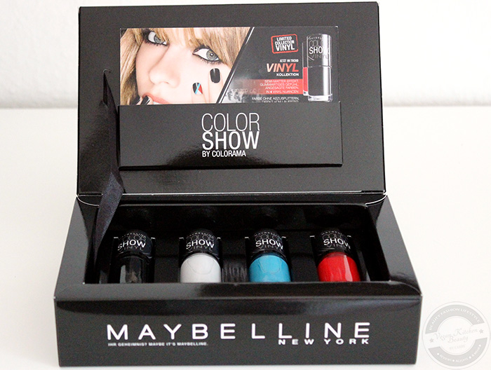 Während meines Urlaubes erreichte mich ein wunderschönes Paket von Maybelline mit den Lacken der neuen Color Show Vinyl LE. Die Verpackung gefiel mir sehr gut, ich mag es, wenn die Pressepäckchen mühevoll gestaltet werden :) Die vier Lacke mit dem semi-mattem Finish werden demnächst in allen führenden Drogerien erhältlich sein und bei einem Inhalt von 7ml 1,95€ kosten.