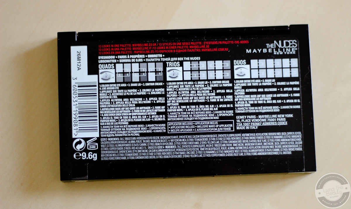 Das Design der Maybelline The Nudes Palette ist durch die schwarze, glänzende Hülle und der hellen Schrift sehr schlicht und elegant. Durch das Sichtfenster sieht man direkt die 12 enthaltenen Lidschatten. Insgesamt ein sehr stimmiges und ansprechendes Gesamtbild. Auf der Rückseite befindet sich ein Aufkleber mit Angaben zu Hersteller und Inhaltsstoffen sowie eine Übersicht über die vielfältigen Kombinationsmöglichkeiten, die sich allein durch Zusammenstellung von Duos, Trios und Quattros ergeben – natürich können diese auch untereinander kombiniert werden.