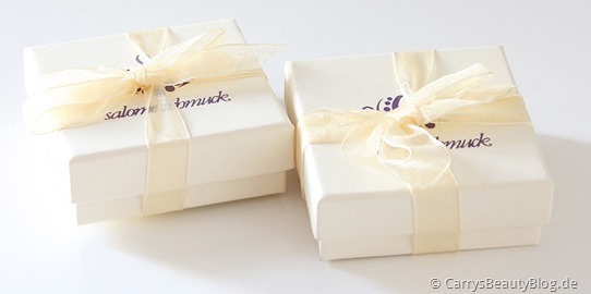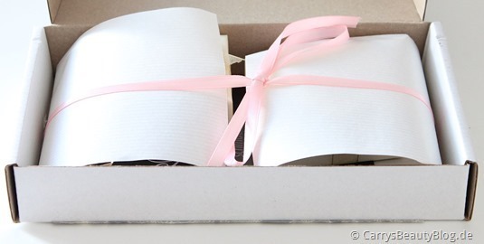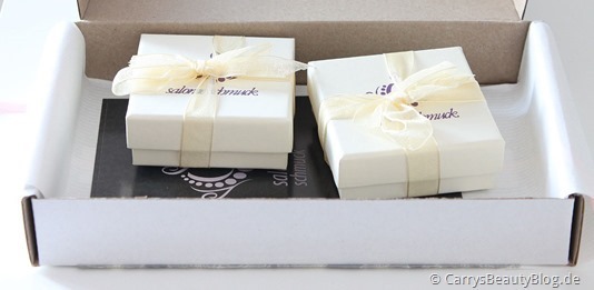 Öffnet man das Päckchen schließlich, so fällt einem direkt die liebevolle Verpackung auf, die Schmuckschatullen sind in etwas dickerem Seidenpapier eingeschlagen, welches zusätzlich mit rosafarbenem Band zusammengehalten wird.