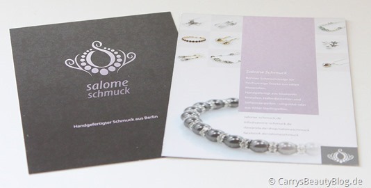 Natürlich darf ein bisschen Werbung nicht fehlen, daher sind auch zwei schön und dezent gestaltete Flyer mit beigelegt. Ich finde nichts schlimmer, als diese überladenen, knallbunten Flyer die ich ständig bei Bestellungen von anderen Online Shops dazu bekomme -.-“ Die schaue ich sowieso nie an und schmeiße sie direkt weg bzw. lasse sie im Karton. Die Flyer von Salome Schmuck sind dagegen echt schön und gebe ich gerne weiter.