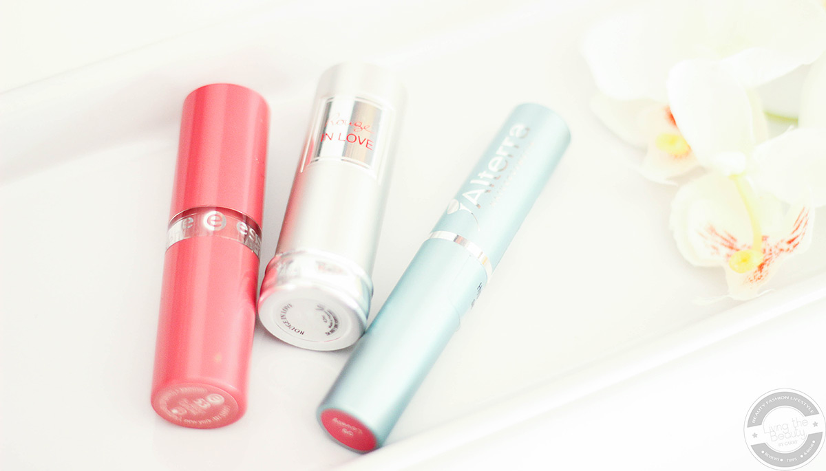 Zu den drei Lippenstiften die ich im Frühjahr am liebsten trage zählen „All about Cupcakes“ von essence (den mag ich allein schon weil meine eine Katze Cupcake heißt <3), „Corail in Love“ von Lancôme sowie „Lovely“ von Alterra, welches mal im Rahmen einer Limited Edition gab.