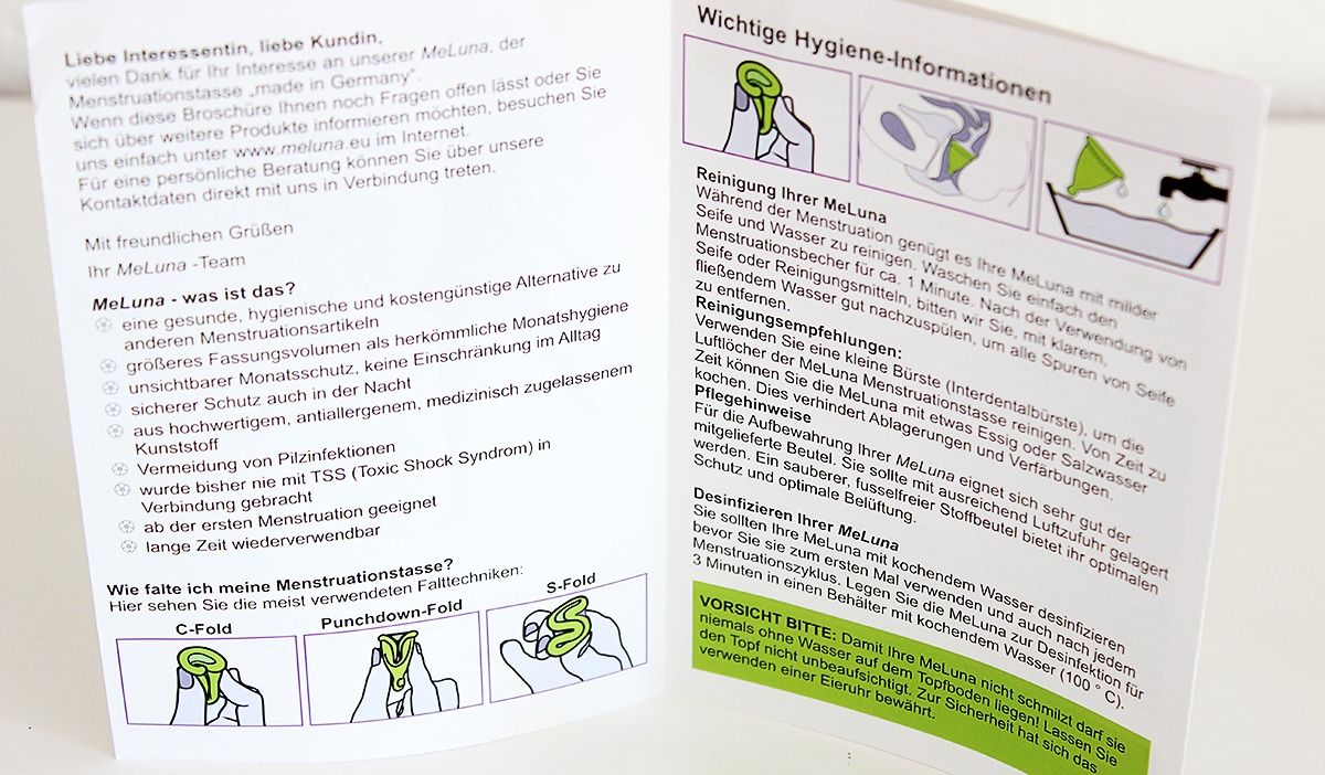 Die Menstruationstasse wird zusammen mit einem kleinen Samtbeutel und Infobroschüre in einer Plastikhülle geliefert. Darin befinden sich alle nötigen Informationen – über MeLuna an sich, wie man sie zum Einführen falten kann bzw. sollte und auch wie man sie richtig reinigt und/oder desinfiziert.