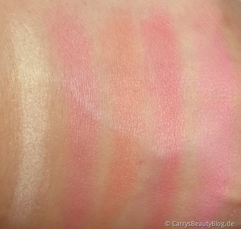 Die Shimmer Stacks enthalten jeweils 5 verschiedene Farben die willkürlich sortiert sind, also nicht von hell nach dunkel. “Gold” ist hier eher als Highlighter und Lidschatten gedacht, während “Pink Zest” ausschließlich als Rouge funktioniert, außer man möchte pinken Lidschatten benutzen ^^