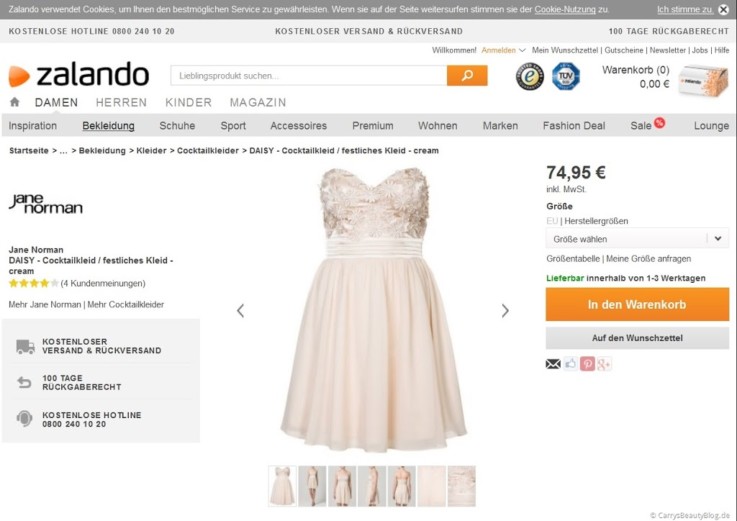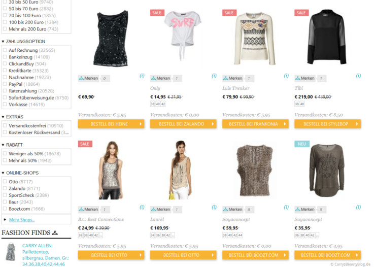 In der linken Sidebar kann man übrigens noch nach Preiskategorien, Zahlungsoptionen, Größe und Farbe des gewünschten Stückes sowie Rabatt und Extras filtern. Man kann auch auswählen, dass nur Produkte eines bestimmten Online Shops angezeigt werden sollen.