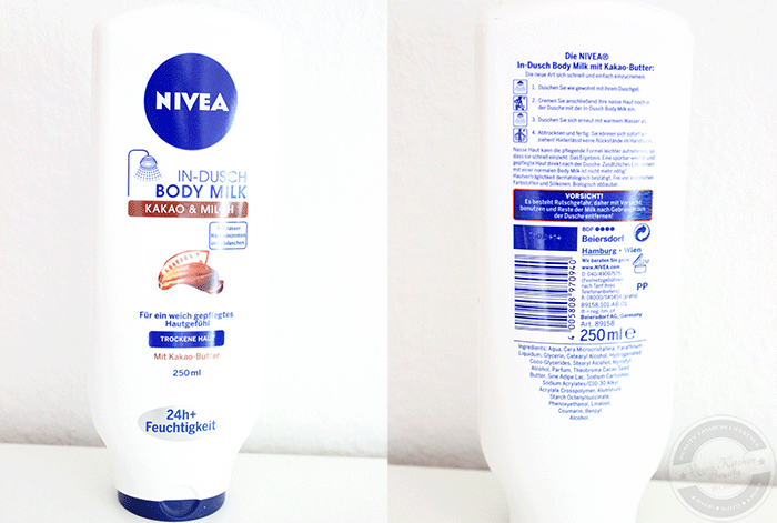 „Die neue NIVEA In-Dusch Body Milk Kakao & Milch mit ihrem sinnlichen Duft pflegt die Haut spürbar und langanhaltend – und das bereits unter der Dusche! Auf der nassen Haut angewendet, spendet die Formel mit pflegender Kakaobutter nicht nur langanhaltend Feuchtigkeit, sondern hinterlässt zusätzlich ein zartes Hautgefühl ganz ohne zu kleben – man kann sich sofort anziehen.“