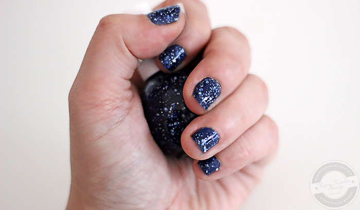 Wie auch sein weißer Bruder „Even now“ benötigte es hier 3 Schichten, um ein deckendes Ergebnis zu bekommen, dafür ist die Dichte der „Flocken“ aber weitaus größer. Die Trockenzeit der einzelnen Schichten ist erstaunlich kurz, sodass man im Nu mit der Maniküre fertig ist.