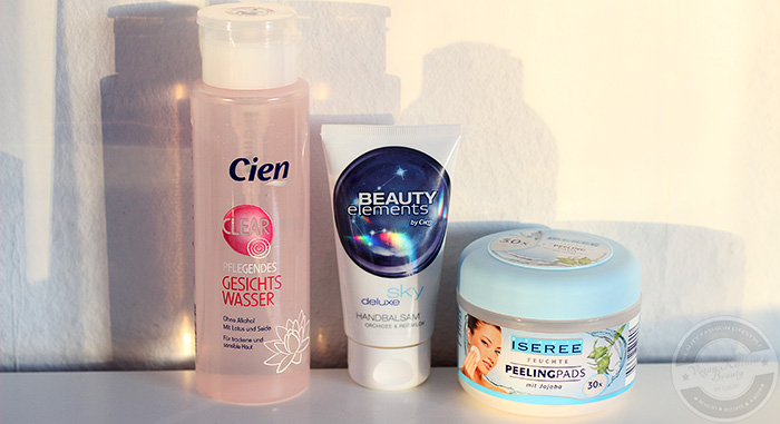 Hierbei handelt es sich um das pflegende Gesichtswasser aus der Clear Reihe von Cien, mit Lotus und Seide, den Deluxe sky Handbalsam von Beauty elements by Cien sowie die Peeling Pads von Iseree.