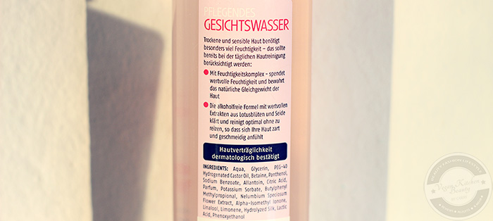 Der Duft ist eine perfekte Mischung aus cremig, minimal süßlich und etwas blumig. Das Gesichtswasser kommt ohne Alkohol aus und ist daher auch für trockene und sensible Haut bestens geeignet – bisher kam es bei mir zu keinerlei Unvertäglichkeitsreaktionen.