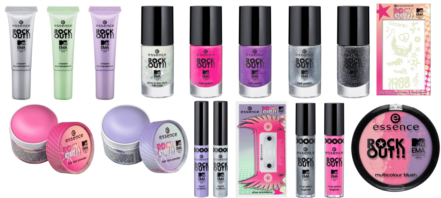 „essence loves music! Mit der neuen trend edition „rock out!“ wird es von Oktober bis November 2014 musikalisch, denn essence ist erneut offizieller Sponsor der MTV European Music Awards. Die internationale Musikszene und deren Fans werden am 09. November 2014 in Glasgow empfangen und können sich wieder auf eine atemberaubende Show freuen. Die trend edition bietet coole Beauty-Pieces und eine stimmungsvolle Farbwelt – bestehend aus Silber, Mint, Pink, Lila und Schwarz. Highlights sind die vinyl shine lipglosse in zwei trendigen Farben und mit Hochglanz-Finish. Die Nägel leuchten mit den Stars um die Wette: Vier Nagellacke, ein Top Coat sowie Nagel- und Body-Tattoos – alle mit glow-in-the-dark-Effekt – verbreiten absolutes Party-Feeling. Die Schuhe erhalten mit dem shoe accessory im Retro-Kassetten-Design den letzten Rock Star-Schliff! It`s showtime… mit essence!“