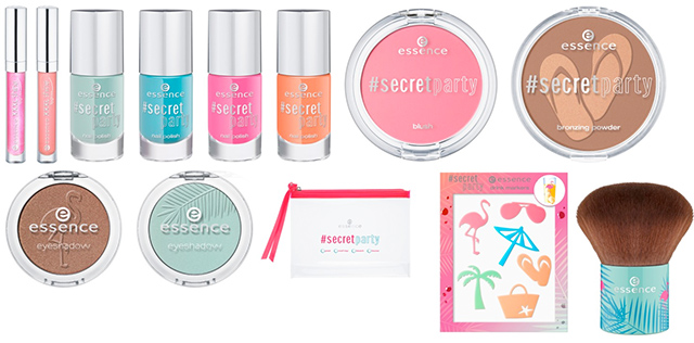 „BY INVITATION ONLY. Nur wenige schaffen es auf die heißbegehrte Gästeliste. Mit der neuen trend edition „#secret party“ feiert essence von Mai bis Juni 2015 die Pool-Party des Jahres. Kühle Drinks, gute Vibes und pinke, aufblasbare Flamingos sowie Schwimmreifen sorgen für absoluten Pool und Party-Spaß! Das passende Styling bietet essence: Sommerliche Bronzing-Produkte, leichte Texturen und eine Farbwelt, die an die Karibik erinnert, bestehend aus Orange, Pink, Türkis, Mint und Braun. Die Must-Haves sind die kabuki brush mit extra-weichem Haar und das body spray für einen leichten Cooling-Effekt auf der Haut. Ein besonders praktisches Highlight sind die selbstklebenden drink markers: Dank der sechs Strand-Motive wie Flamingo oder Palme lässt sich das eigene Glas auch unter vielen anderen ganz schnell wiederfinden. #bestpartyever – mit essence!“