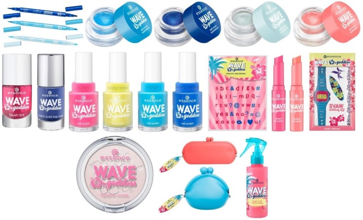 Wellenreiterinnen, Surfer-Girls und Beach-Beauties aufgepasst: Mit der neuen essence trend edition „wave goddess“ geht es von Juli bis August 2014 zum Strand und ab auf‘s Surfbrett. Egal ob Wellenreiten oder Stand-Up-Paddling – Surfen ist auch in diesem Sommer die Trendsportart schlechthin! „wave goddess“ bietet dafür die passenden strandtauglichen und wellenerprobten Produkte. On top sorgen die absolut stylischen Beauty-Pieces durch das Hibiskusblüten-Design für jede Menge Summerfeeling! Neben den leuchtenden Farben Orange und Pink steht die It-Sommer-Farbe Blau in all ihren Facetten im Fokus. Must-Haves gibt es einige: Zwei wassertaugliche Produkte mit tint-Effekt für Lippen und Wangen, einen Top Coat, der die Nagellackfarbe je nach Temperatur verändert, und ein styling spray mit Meersalz für perfekt welliges beach hair. Zwei sommerliche Accessoires, die in jede Strandtasche gehören, hat die trend edition mit der Geldbörse und dem Sonnenbrillen-Etui auch noch zu bieten. Ab auf‘s Brett, die nächste Welle kommt… mit essence!