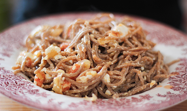 - Wenn die Nudeln bissfest sind das Wasser abschütten und sie mit in die Pfanne geben.