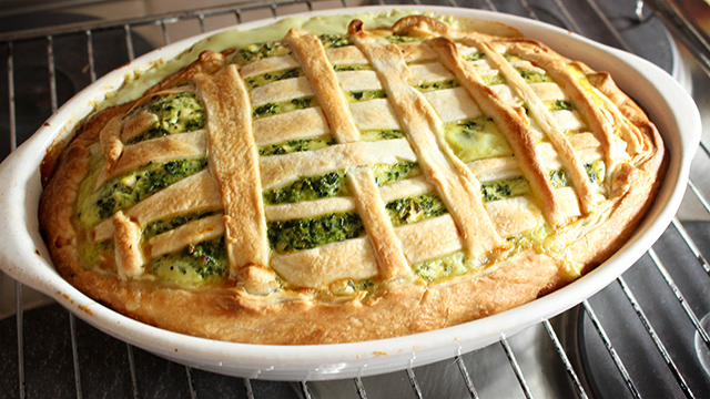 - Auflaufform einfetten, Blätterteig hineinlegen, an den Rand drücken und überstehende Reste abschneiden.