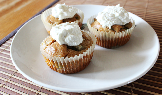 - Das Frischkäse Topping auf den Muffins verteilen.