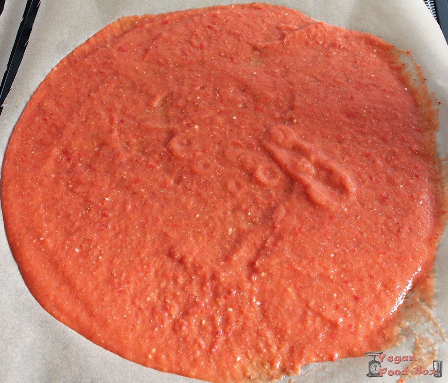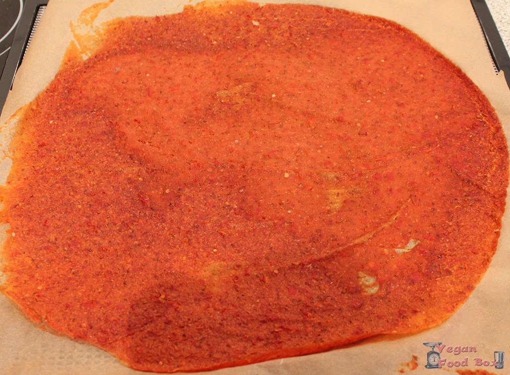 Das ganze auf den 4 oder 5 Dörrfolien bzw. mit Backpapier ausgelegten Backofenblechen verteilen. Achtet darauf, dass es wirklich gleichmäßig ist, sonst dauert das trocknen länger und das was schon trocken ist wird trockener als der Teil, der noch feucht ist.
