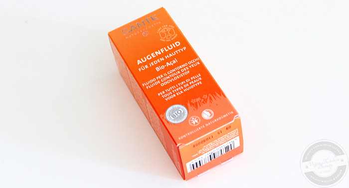 Das Augenfluid von Sante komm in einer orangefarbenen, auffälligen Pappverpackung. Darauf sind in weißer Schrift sämtliche Angaben zu Produkt, Hersteller und Inhaltsstoffe aufgedruckt. Das Fluid selbst befindet sich in einem milchigen, breiten Pumpspender mit abziehbarer Abdeckung.