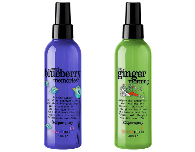 „Die neuen treaclemoon Körpersprays gibt es zunächst in zwei limitierten Duft-Editionen, die wir in praktische Pumpspender mit je 200 ml Inhalt gefüllt haben. Einfach aussprühen – und schon verbreitet sich entweder die belebende Wirkung des ingwerfrischen Dauerbrenners „one ginger morning“ oder die funkelnagelneue Abenteuerlust des blau-beerigen Newcomers „sweet blueberry memories“.