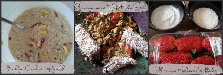 Zum Frühstück gab es an diesem Tag das Breakfast-Crunch mit Hafermilch. Eigentlich gehört da Mandelmilch dazu, ich war aber zu faul welche herzustellen und hab auch keine challengetaugliche zuhause, mit Hafermilch hat es aber auch gut geschmeckt :) Das Breakfast-Crunch fand ich echt lecker und wird so sicher noch öfter gemacht, allerdings muss ich dann noch irgendwo weitere Cranberrys und Goji-Beeren auftreiben ^^