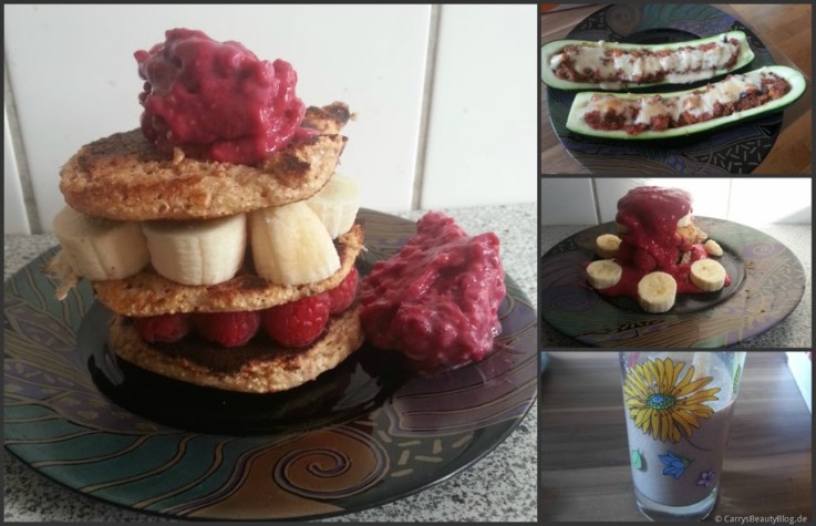 Zum Frühstück gab es jeweils die Pancakes mit Himbeereis, am zweiten Tag wurde daraus Himbeersoße, da die tiefgefrorenen Himbeeren mittlerweile aufgetaut waren, ich habe ja kein Tiefkühlfach ^^ Auch dieses Rezept gehört definitiv zu meinen liebsten, wobei mir bisher jedes Rezept absolut geschmeckt hat, vor allem aber die Frühstücksrezepte ^^ Das Eis ist übrigens mit Sojajoghurt gemacht ;)