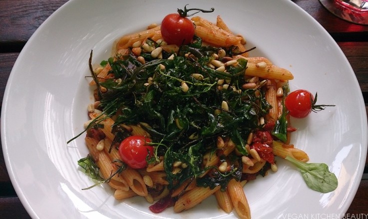 Ich fand mein Essen einfach nur mega lecker. Der gebackene Rucola war richtig köstlich, Pinienkerne mag ich sowieso und auch dass ich bei den Nudeln fast Feuer gespuckt hätte war in der Kombination echt interessant. Leider fand die Mutter meines Freundes ihr Essen nicht ganz so gut, es hat einfach eine Soße gefehlt und war somit recht trocken. Die fleischhaltigen Gerichten der anderen haben wohl allesamt geschmeckt.
